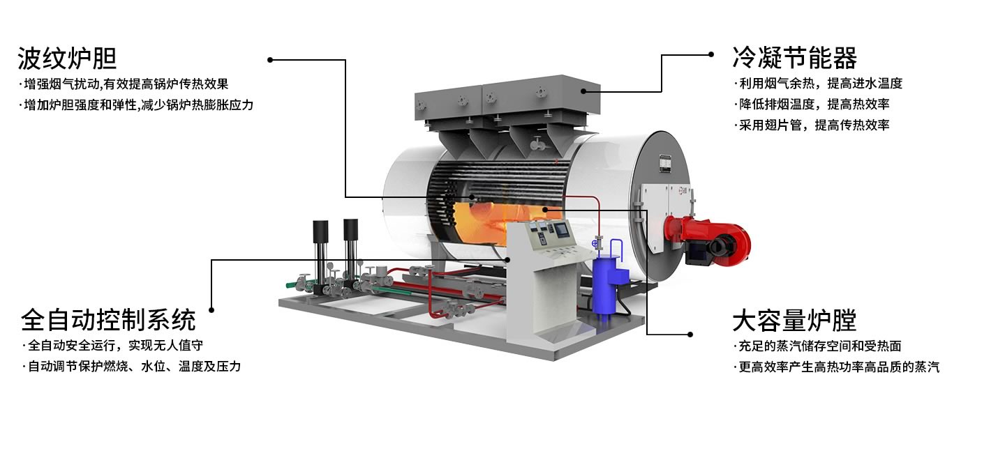 WNS系列低氮冷凝鍋爐是一種全自動、臥式內(nèi)燃、低氮冷凝于一體的快裝燃油(氣)鍋爐。鍋爐本體采用濕背式兩回程結(jié)構(gòu):波形爐膽及回燃室為第一回程,螺紋煙管構(gòu)成第二回程。節(jié)能器和冷凝器置于鍋爐頂部,于爐外構(gòu)成煙氣的第三回程。
